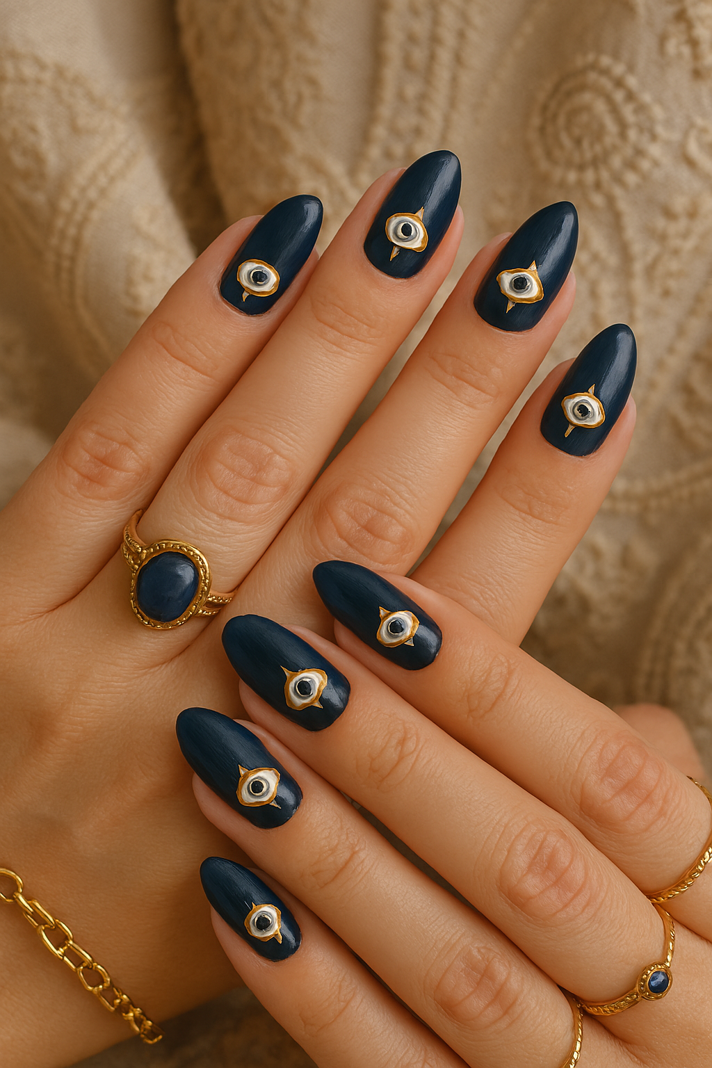 The evil eye motif has deep cultural significance across Mediterranean and Middle Eastern traditions. On a dark blue base, it becomes both protective and stylish.